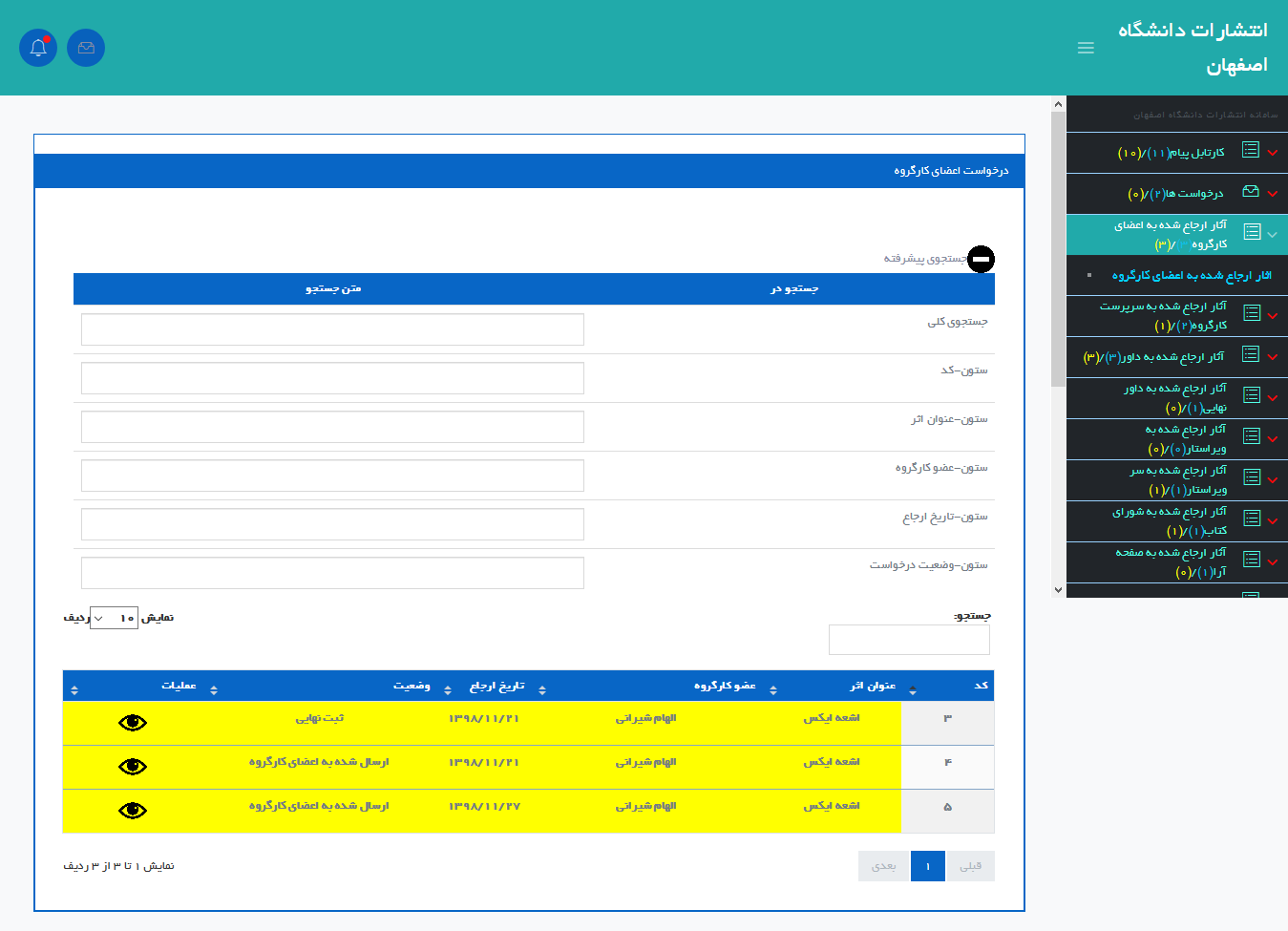 شامل جدول هوشمند و جستجوی هوشمند بر روی تمام ستون های جدول ونمایش تعدادکل آثار ارجاع شده به سرپرست کارگروه به همراه تعدادآثار ارجاع شده به سرپرست کارگروه جدید و آثار ارجاع شده به اعضای کارگروه دراین جدول آثاری که اعضای کارگروه ارجاع شده است نمایش داده می شود وبا انتخاب آن اثر میتوان آن اثر را مشاهده کرد